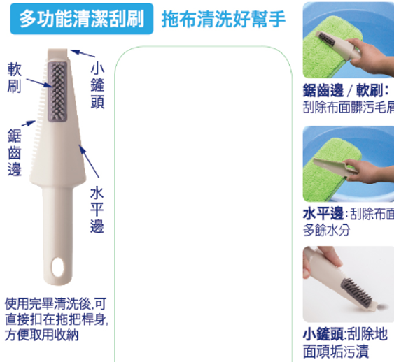 清潔刮刷除了能夠幫助我在刮除拖把尚的髒污與毛屑,洗完拖把以後的水份也用這款清潔刮刷刮除,