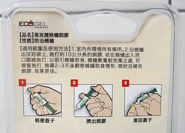 使用方式和除蟑餌膠一樣 : 先輕壓蓋子拔出來,擠出餌膠於螞蟻出沒處,再蓋緊蓋子