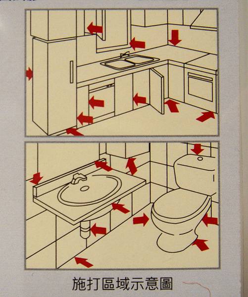 廚房與廁所水管處(擠出的除蟑餌膠呈暗黃色)
