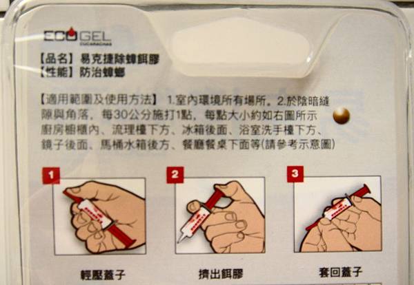 使用方式很簡單:先輕壓蓋子拔出來,擠出餌膠,到蟑螂經常出沒的陰暗縫隙、角落施打一點