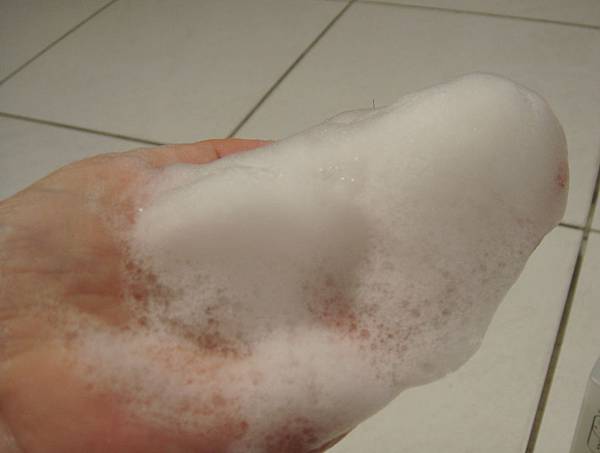 加水清輕搓揉琥珀色的洗髮精後,慢慢地就變成質地潔白細膩的泡沫