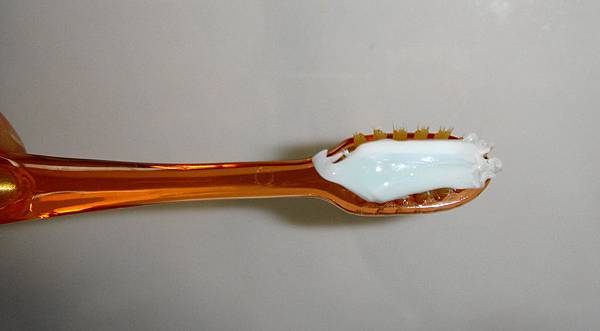 擠壓適量的2080三重亮白修護牙膏在牙刷上