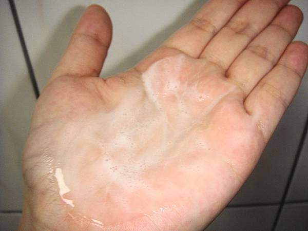 微米淨透水潤洗髮乳倒出來呈乳白色,聞起來有股淡雅的香氣