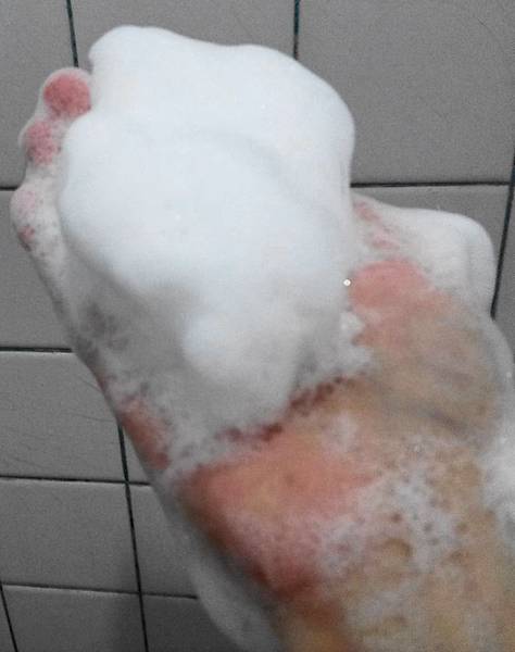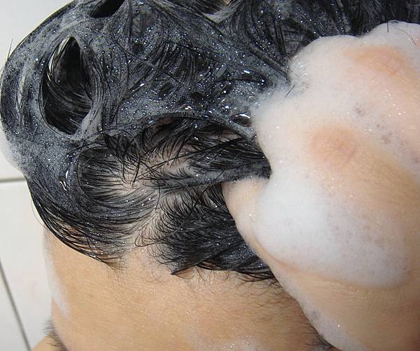 將泡泡塗抹在頭髮與頭皮上清洗與按摩,清洗的過程中可以感覺到頭髮與頭皮毛孔徹底清潔後的清爽感