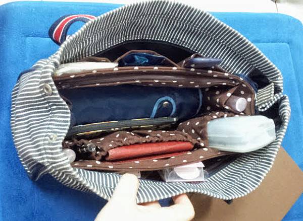 不過, 大容量的包款常常有個惱人的地方, 就是包包的內裝只有一兩個口袋可用(有的幾乎沒有什麼分層) , 裡面的零錢包、化妝袋、面紙、雨傘、手機、耳機線...等大小物品統統擠在一起, 總要一翻再翻才能找到要用的物品
