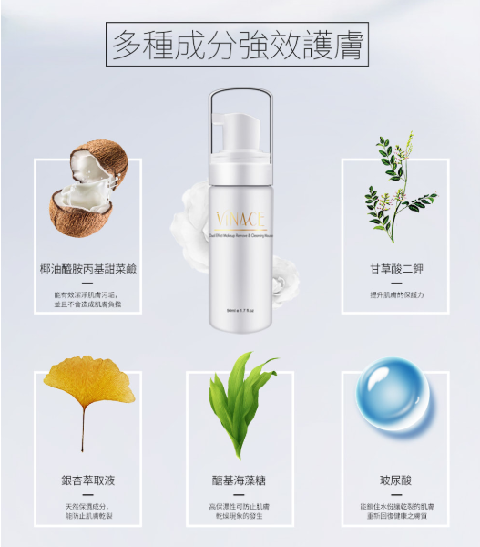 『ViNACE米爾娜斯』雙效洗卸顏慕絲內含多種強效護膚成分